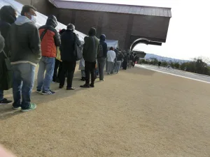 朝1番の予約、やはり人気なので、すでに行列 !! 今日は、風もあり寒さの中、開館を待ちました
